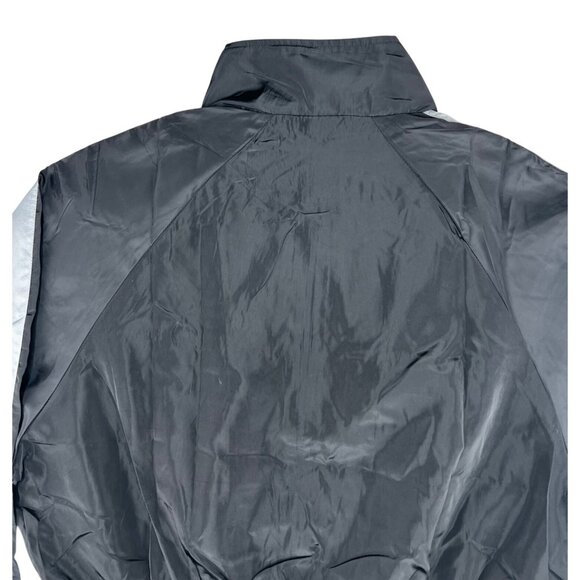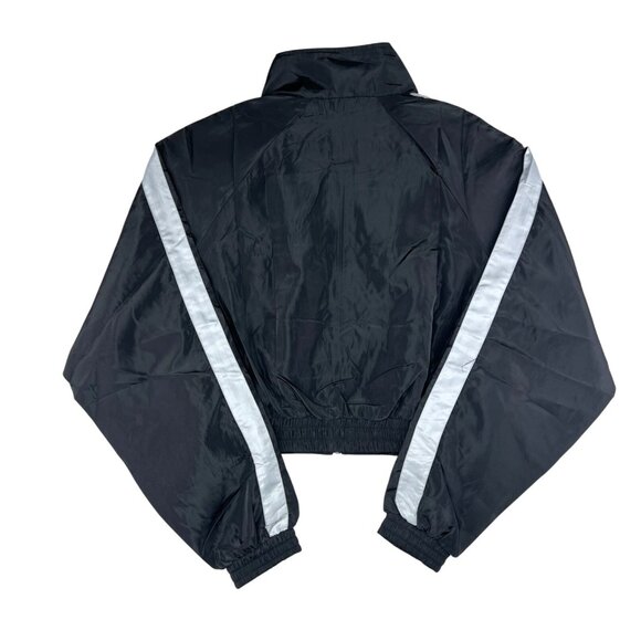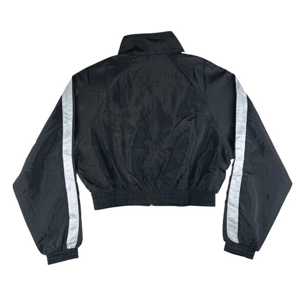 This cropped nylon jacket combines functionality and style. Its reflective stripes add visibility, while the zippered front and elastic hem ensure comfort. The lightweight, breathable polyester makes it suitable for various weather conditions, and its contemporary design complements casual and athletic outfits alike, reflecting a perfect blend of utility and fashion.