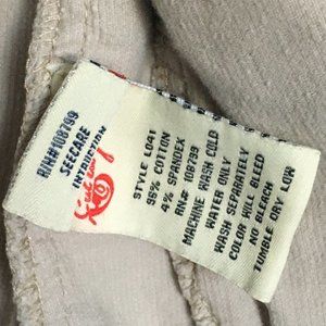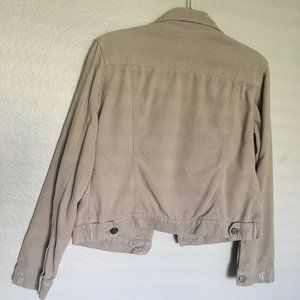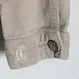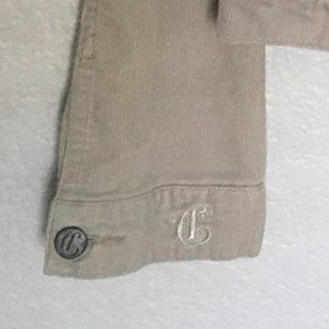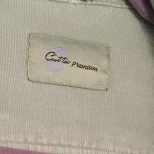 C'est Toi Premium 96% cotton, 4% spandex khaki corduroy with embroidery and rhinestones on front pockets, logo on buttons, size S, back L 19", chest W 20", sleeve L 23", pre-owned in good condition