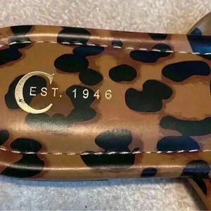 C’est brown and tan, animal print women’s slip on sandals with center circle medallion; size 9