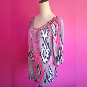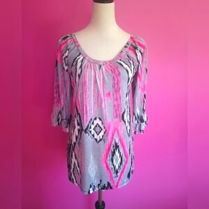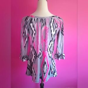 Cezanne Ladies Gray & Pink Geometric Tunic Blouse (Size Large)