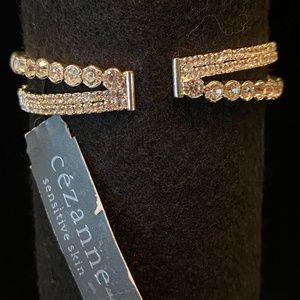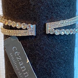 This Cezanne silver color Rhinestone Cuff Bracelet fits any wrist. It has a single overlap in design. All rhinestones are intact but I couldn't capture in the photo the beautiful sparkle they give off. Tag attached and box is provided. Per tag, this item was made for "sensitive skin".