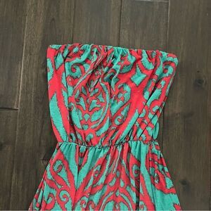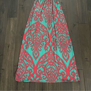 Cezanne Strapless Teal & Red Damask Print Maxi Dress. Elastic waist. Size M. Perfect for summer, beach, vacation, resortwear and more!