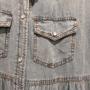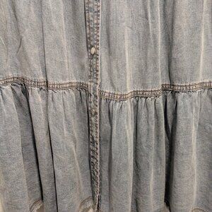 So, so comfortable denim blue tiered dress. It has mother of pearl snaps up the front and two usable pockets on the bodice.