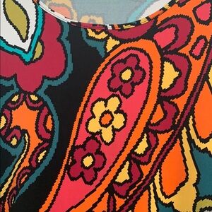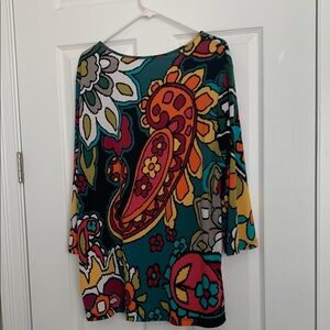 This eye-catching blouse by Cha Cha Vente features a vibrant graphic design in blue and orange hues. The 3/4 sleeve length and relaxed fit make it a stylish and comfortable choice for any occasion. Crafted from a soft, draping fabric, this top offers a chic and artistic flair to your wardrobe. Excellent condition. No rips or stains. Size 1x. Polyester stretch material. Armpit to armpit is approx 24 inches. (See photos) color as seen in photos