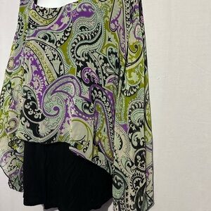Elevate your wardrobe with this eye-catching asymmetrical top featuring a paisley print. The mix of purple, green, and black creates a bold statement piece. The flowy design adds a touch of elegance and comfort. Pair it with your favorite jeans or leggings for a chic look.