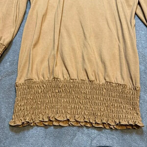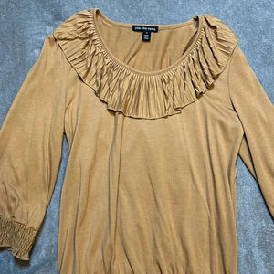 Keywords: Ruffle, Shirt with Ruffle Detail, Ruffle Collar, Statement Collar, Camel color, Light Brown Shirt with Ruffles