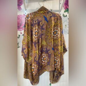 Vibrant kimono cardigan with a paisley pattern. Features a mix of yellow, blue, and brown colors. Perfect for layering.