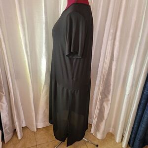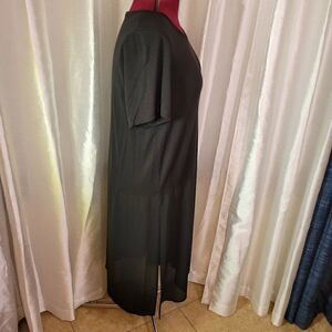 Solid black color, scoop neckline, short sleeves, sheer from waist bottom, and comfortable and the fabric feels stretchy. This top will look great with leggings and cute pair or flats or some skinny jeans with some cute boots or some sexy high heels.