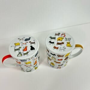 ChaCult Fine Porcelain Matching Cat & Dog Tea Cups Mugs with Lids Set of 2