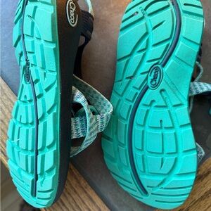 Stylish sandals with teal and black straps. Perfect for casual outings.
