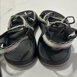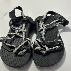 Stylish Chaco sandals in black with gray straps. Perfect for outdoor adventures.