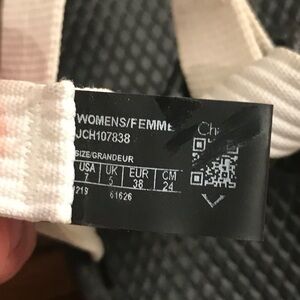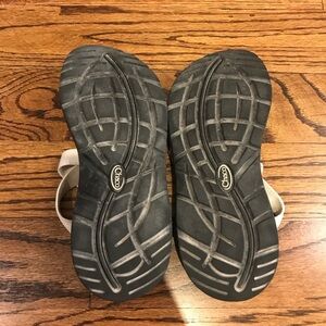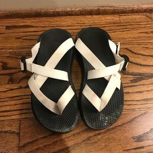 Comfortable Chaco sandals with crisscross white straps. Durable black soles for everyday use.