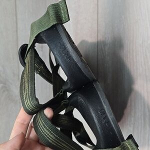 Durable Chaco sandals with olive green straps. Ideal for outdoor activities.