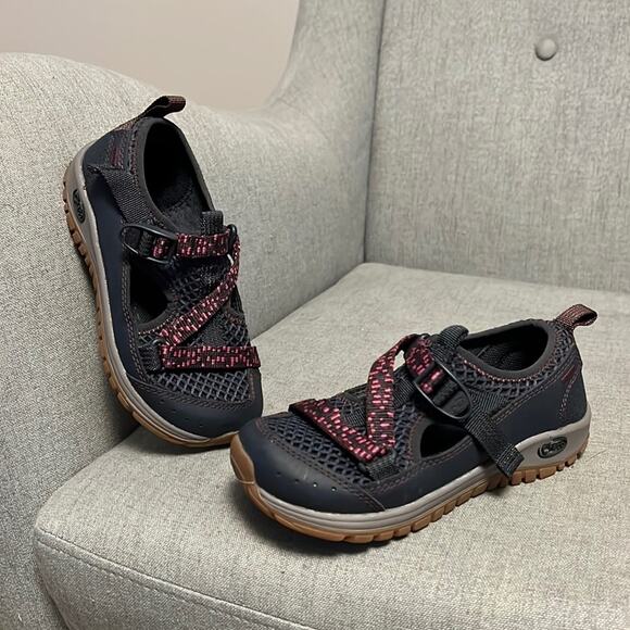 Overcome rivers, trails, or just the playground. The all-terrain, closed-toe Odyssey sport sandal for kids delivers the durable closed-toe performance they need from land to water. UPPER: Breathable mesh upper with polyester jacquard webbing Synthetic overlays for added structure and toe protection MIDSOLE: Durable LUVSEAT PU footbed Barefoot construction with layered PU foam midsole OUTSOLE: Non-marking EcoTread 25%-recycled rubber compound 2mm lug depth with playful sipped "Z" lugs