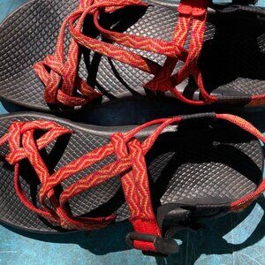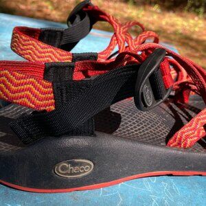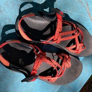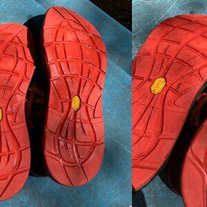 Hardly-worn Chaco sandals. No structural wear on soles or tops. Dirt stains on soles (see pictures). Adjustable straps in good working order (slide and hold well).