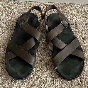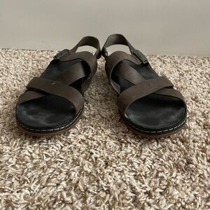 EUC pair of Wayfarer style sandals from Chaco in a size 8. These sandals have dark brown leather straps with a buckle at the ankle. Some signs of wear on the insole as pictured. No stains or flaws!
