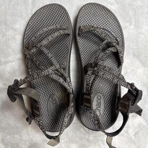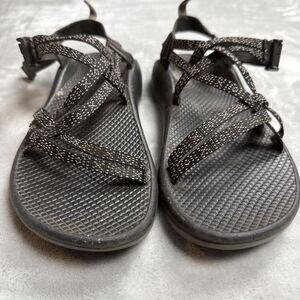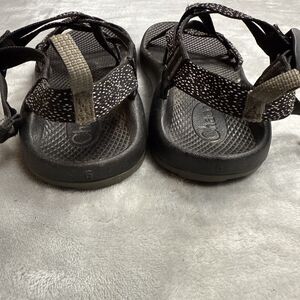 Experience durable comfort and versatility with these Chaco womens sandals, estimated size 8 (10 inches heel to toe). Perfect for outdoor adventures or casual wear, they feature adjustable webbed straps, a supportive contoured footbed, and non-slip soles. The sleek black color with subtle patterned straps offers a timeless look ready for hiking, travel, or everyday summer outings.