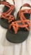 Chaco sandals with vibrant coral orange straps. Adjustable straps. Size 7W. Great for size 6.5 too (like me)!