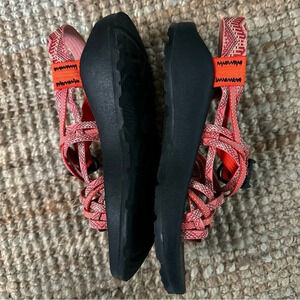Triple-strapped polyester jacquard webbing upper wraps around the foot and through the midsole for a customized fit
