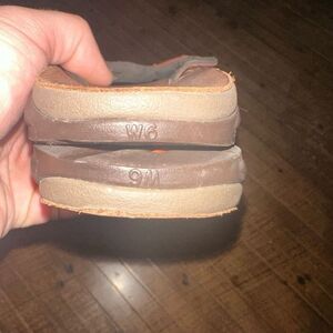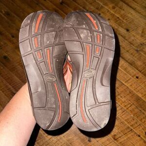 Chaco leather, gorpcore, outdoorsy,brown, slip on, comfortable flip flops. Comfortable, versatile shoes. Some wear, but overall in good condition.