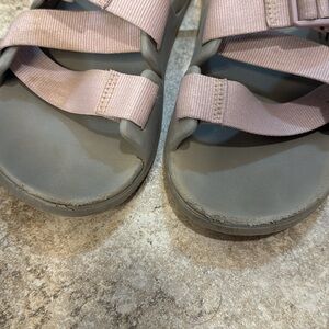 Gray with purple straps. Some staining but gently used. Adjustable straps. Great for wide feet.