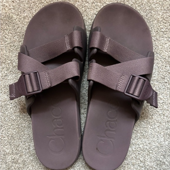 Cute purple Chaco slides! Love these but they pinch my foot a little due to a high arch and wide feet. Lightly worn