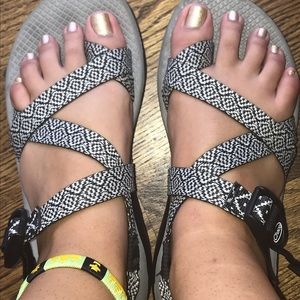 Black and white patterned chacos with a grey footbed. In good used condition. Only flaw is a few footprint marks on the footbed (shown in picture) otherwise they are in perfect condition!