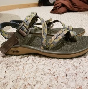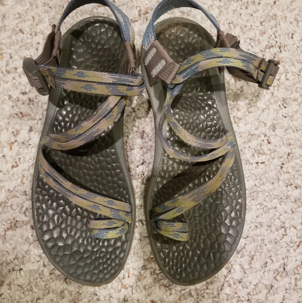 Blue, green, and grey chacos double with toe strap very comfortable and work nice but i have a different pair and just don't wear them enough size 9