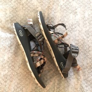 Grey base, multi color double strap, adjustable straps, great condition! They are frayed on one strap but have been like this since I first received them 4 years ago and the fraying has not gotten worse even after lots of wear (see last photo). You can even cut this strap off and pull it out if desired. These are sturdy, and in good condition. Great quality (and cute) outdoor shoe. Sad to see them go!