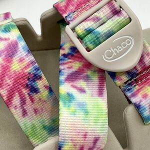 Chaco Women's Chillo sandals in size 9, slip-on style with adjustable straps The sandals have a flat heel and a rubber outsole, making them suitable for activities such as walking, hiking, yoga, and casual wear. The Tie Dye Chillo design adds a colorful and vibrant touch to the multicolor sandals, which are perfect for summer, fall, and spring seasons. With the Chaco brand known for quality and comfort, these sandals are a stylish and functional choice for active women on the go.