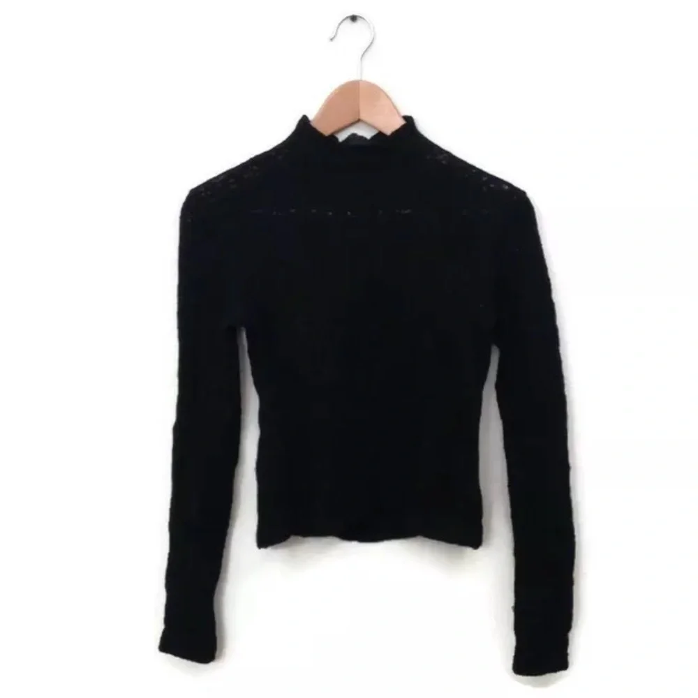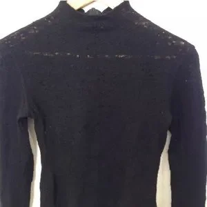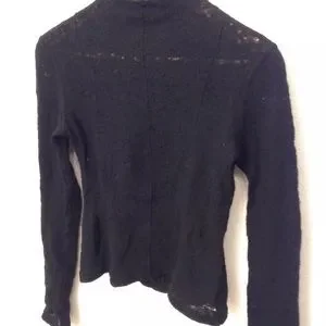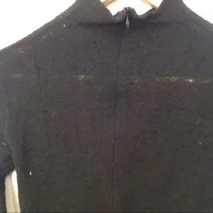 This is a fun pre loved chado Ralph Rucci Black Open Knit Long Sleeve hole Distressed sweater doesn't have a size but I think it's a small -bust laying flat is 16.5" feels like wool but not sure in good condition does have some holes that are bigger then they are meant to be but it goes with the look and some fuzz great piece for going out or layering