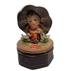 Hummel-like Girl w/Ducks and umbrella plays Raindrops Keep Falling on my Head Vintage 1970 Very good preowned condition. Comes from a smoke free, pet free home. Please review photos for measurements and verification of condition. Color may vary slightly due to lighting.