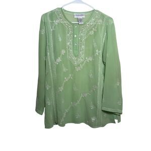 Chadwick's Blouse Women's 12 Green Embroidered Popover Sheer Top Boho Sequin