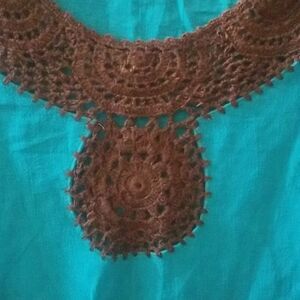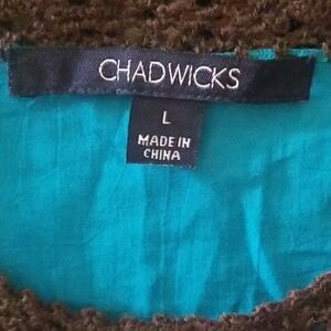 This Chadwicks 3/4 sleeve shirt is Turquoise with brown crochet trim around the top. It has brown stiching at bottom and ends of sleeves. Perfect Western look.