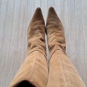 boho chic boots, vintage suede boots, minimalist fashion, classic knee high boots, retro style boots, camel suede boots, 90s fashion boots, western inspired footwear, elegant fall boots, timeless leather boots, soft suede boots, Chadwicks boots, block heel boots, pointed toe boots, zip up boots, tall leather boots, neutral tone footwear, autumn fashion, cozy chic boots, effortless style, wardrobe staple, transitional season boots, sleek silhouette, casual luxe, feminine edge, everyday elegance
