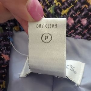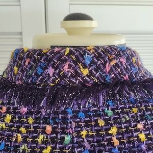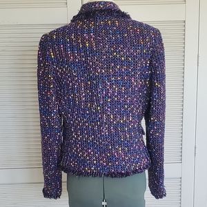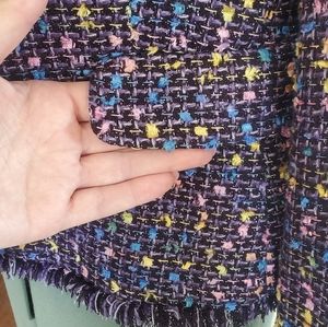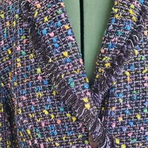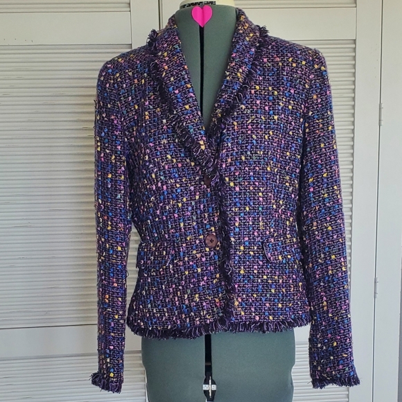 Chadwicks | jacket blazer. multi color main color black and purple with green yellow pink silver blue green. two buttons. false flap pockets. frayed edge detail. long sleeve. fully lined