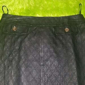 This beautiful, black leather skirt has a lovely stitched quilted detail with gold buttons. It zips in the back and has a small split. It's a size 6.. It is new.