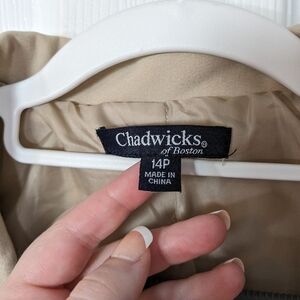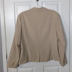 Polyester, Rayon, Spandex, Blazer, Jacket, Tan, Brown, Beige, Career, Office, Workwear, Work, Chadwick's of Boston, Chadwicks, Size 14, Mid Size, Mid Sized, Size 14P, Petite, Size 14 Petite, Women, Woman, Women's, Long Sleeve, Collared, Collar, Button Up, Button Down, Pockets, Preppy, Prep, School, RN 123125