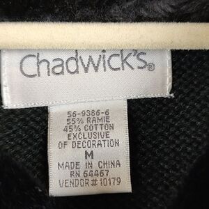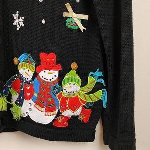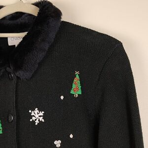 Chadwick's Black Cardigan Applique Embroidered Christmas Sweater. This Grandmacore Christmas Sweater has a faux fur collar, black buttons, pearls and silver sequins, embroidered christmas trees, snowflakes and wreaths, and 2 sets of three snowmen! So festive and easy to wear for all of your holiday occasions. 55% ramie and 45% cotton in Size Medium.