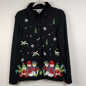 Chadwick's Black Cardigan Applique Embroidered Snowmen Christmas Sweater