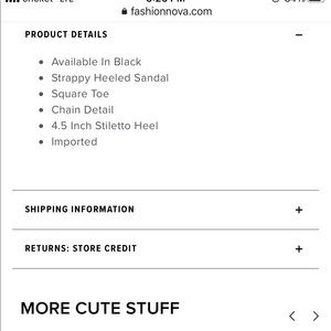 This is a stiletto heel in the color black. It has gold chains around it. Square toe. It’s approximately 4.5 inches. Only tried on. Brand new with box.