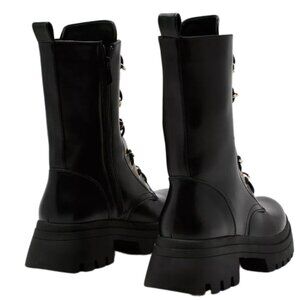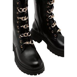 Worn Once. Zip Closure-Rounded Toe-Chunky Lug Sole- Chain Detailing on Laces - Block Heel. Outer made from Synthetic PU Material- Heel height approx 2.2". Size 38- US8. They run small. I am always a standard size 8 and these fit snug without socks. Approx 11" from bottom of heel in back to top of boot. No scuffs or scratches. No holds or trades please.
