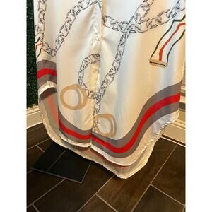 Elevate your style with this chic oversized button-front maxi shirt dress, featuring a unique chain link design! This brand new with tags (NWT) dress in size large boasts a stylish white, red, and grey color palette. The high-low design adds a modern touch, while the two functional front pockets enhance practicality. The one-button sleeve detail adds a touch of sophistication.