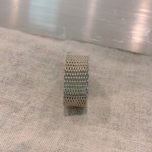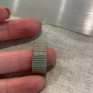 Classic chain link ring. Same style as a Tiffany ring but there is no marking on inside. (This is my ring and I actually thought it was purchased at Tiffany’s but after doing research, mine does not have any Tiffany markings on inside as others I have seen, so I cannot confirm this.) size is approximately a 7. Sterling silver.