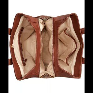 Gold-tone hardware & chain detail, exterior back zip pocket, triple compartment interior with zip & slip pockets