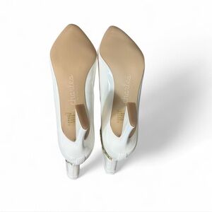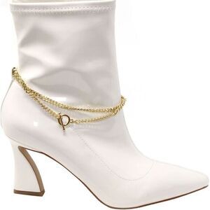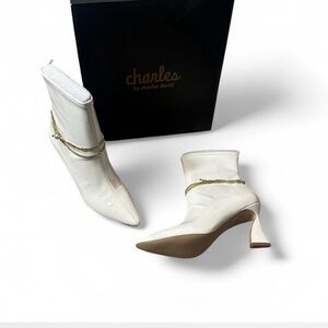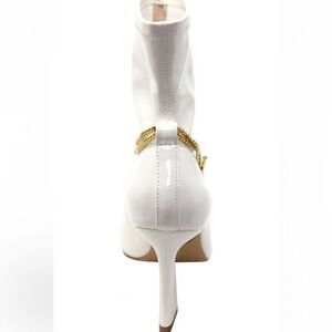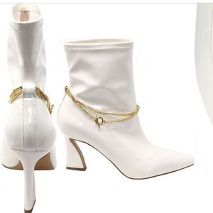 Chain Pointed Toe Bootie. Pull on style featuring a draped chain with sleek pointed toe and flared statement heel. Approximately 3.25” heel height. Chain is removable with toggle. NEW WITH BOX