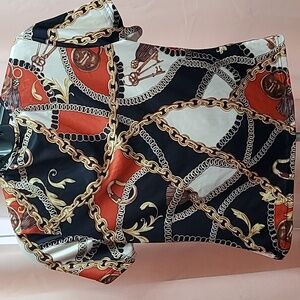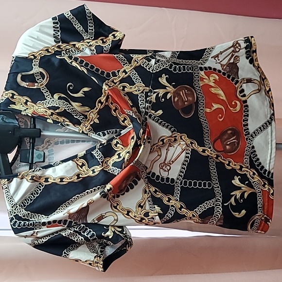 Stylish short sleeve top with a chain print design. Features a mix of black, white, and gold colors.