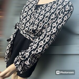 Elevate your style with this chic chain print wrap blouse. Featuring a sophisticated black and white design, this top is perfect for any occasion. The wrap style adds a flattering touch to your silhouette.