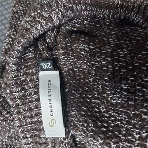EUC Chain Stitch oversized sweater in a brown grey with red stripe sleeves. Measures pit to pit 27", sleeves 42", waist 27" and length 31"