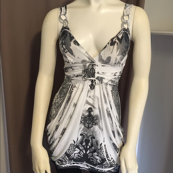 Black, grey and white printed tank with double chain link detail in the straps. Longer almost tunic length, perfect with leggings and boots. Crazy soft fabric with some stretch. EUC